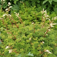 バラ科の宿根草で和名を「ヤマブキショウマ」。この品種は矮性で乳白色の小さな星型の花が花穂を形成している。朝鮮半島原産で草丈は低い。淡い緑色の細かい切れ込みの葉が美しい。半日陰〜日向に適す。